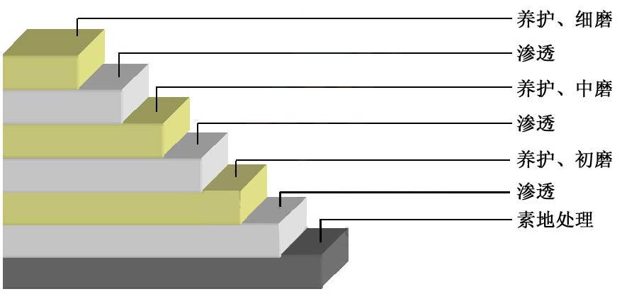 施工工藝:(清理基面→打磨、清潔→施工高滲透密封固化劑(特殊基面可進行三次滲透或多次)→清洗基面→初步拋光→全面拋光)