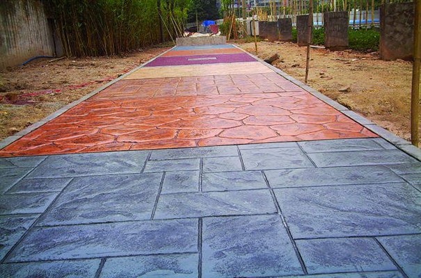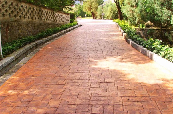 5、進行壓印,使模具陷入混凝土中,陷入的深度與模具和施工人員使用的力度有關。其實,施工經驗豐富的技術工人能使壓印的紋理均勻、深淺一致,表面的紋理凹凸有致,作用逼真。