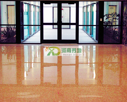 以純環(huán)氧樹脂配合彩色石英砂增加地坪的耐磨損、耐強(qiáng)力沖擊等性能,且裝飾效果好。